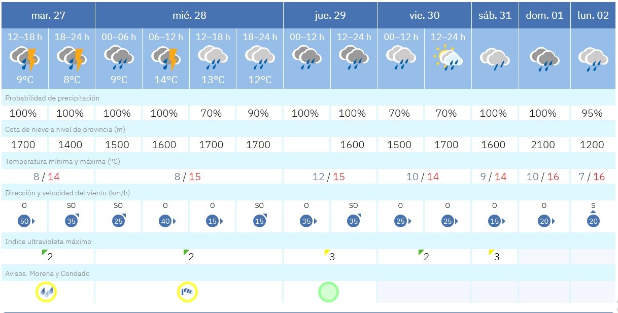 Según la previsión de la Aemet, la jornada desde el martes 27 se presenta especialmente complicada, con un 100% de probabilidad de lluvia y tormentas que han activado el aviso amarillo por acumulación de precipitaciones en la zona.